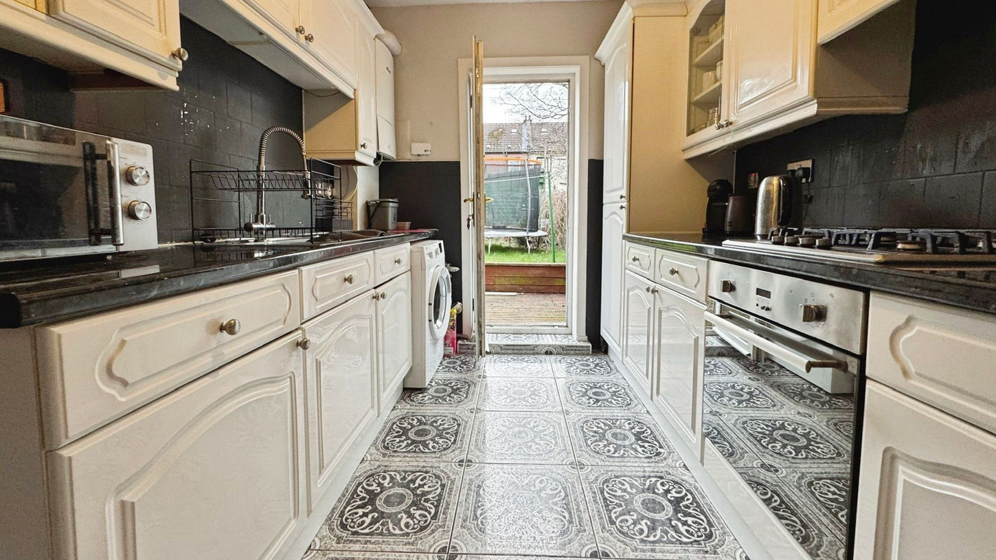Immaculately presented end-terrace two-bedroom family home situated within a popular residential pocket of Tollcross, offering well-proportioned accommodation along with excellent outdoor space and private parking.